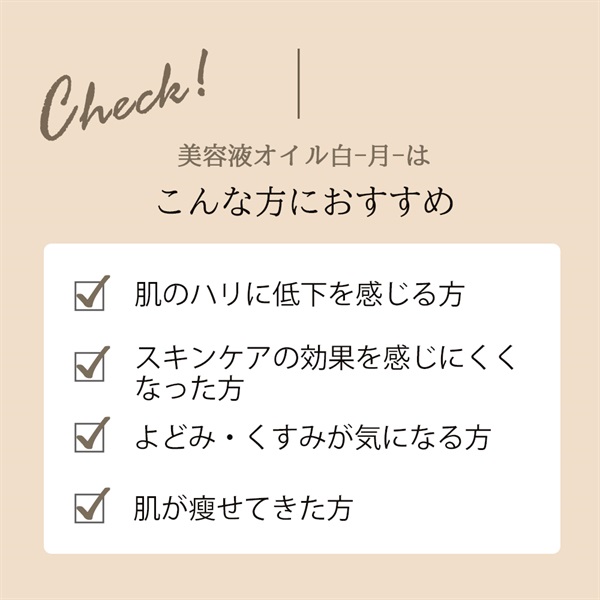 オイルと美容液の二層式。日本女性の皮脂に近づくよう、4種の植物オイル(※)を厳選配合。減少しがちな皮脂を補い、肌の潤いを閉じ込めます。さらに21種もの和漢・植物エキス配合で、乾燥小ジワを目立たなくし、もっちりハリのある肌へ。 ※オリーブ果実油、ユズ種子油、ツバキ種子油、コメヌカ油