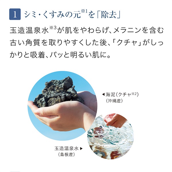 沖縄の海泥クチャ(※1)がシミ・くすみの元となるメラニン角質(※2)を絡めとる泥パック。