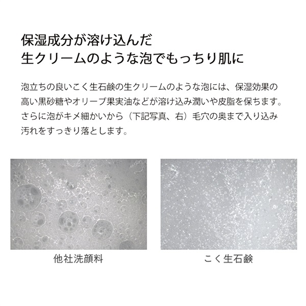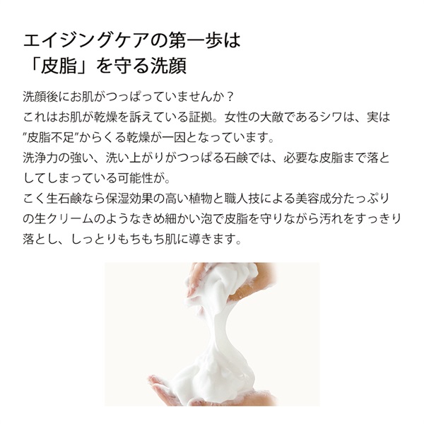 2種の天然植物オイル(※)配合。生クリームのようなキメ細かい泡で、汚れだけ落として潤いと皮脂は守る洗顔石鹸。