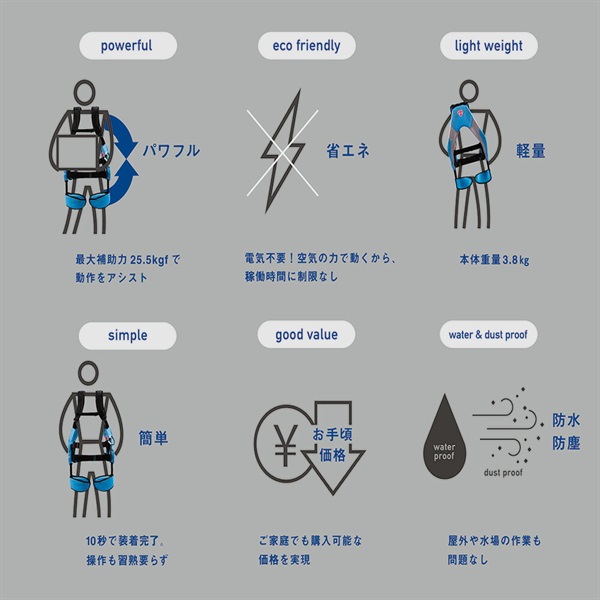 タイプ 】 ソフトフィット/タイトフィット【サイズ】 適用身長(推奨) S-Mサイズ:150cm~165cm M-Lサイズ:160cm~185cm【本体重量 】 3.8kg ※カバー含まず【駆動源】 圧縮空気【アクチュエータ】 McKibben型人工筋肉【圧縮空気供給方法】 手動式空気入れ【補助力】 25.5kgf(100Nm)【使用環境温度】 -30℃~50℃【防塵・防水性能(保護等級)】 IP56【本体寸法】 高さ×幅×奥行 S-Mサイズ:805mm/465mm/170mm M-Lサイズ:840mm/465mm/170mm【腰ベルトサイズ】 105cm【メーカー保証期間】 6ヶ月/購入後1ヶ月以内の製品登録にて1年に延長ご注意・本製品は腰を補助するものです