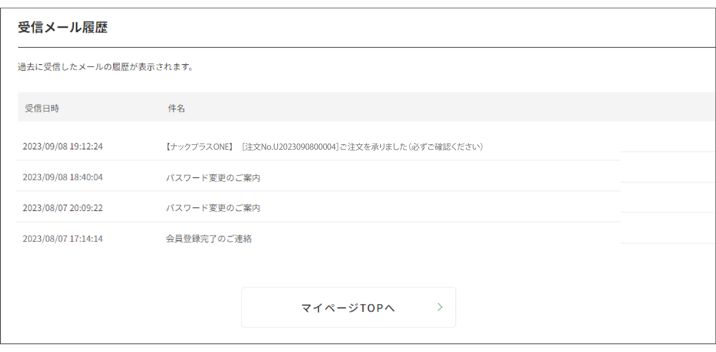 注文完了メールや定期便発送メールなど、ナックプラスONEからのお知らせをご確認いただけます。 ※キャンペーンや新商品のお知らせメール、お問い合わせの返信などは表示されません。お客様がお使いのメールソフトをご確認ください。